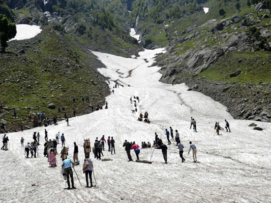 Chandanwari, located 15 km from Pahalgam, is the starting point of the famous Amarnath Yatra. It is also famous for the snow sledging on a snow bridge. Surrounded by snow-dusted mountains and the Lidder River flowing by, Chandanwari is perfect to enjoy a picnic with your family and enjoy the natural beauty. Chandanwari remains covered in snow from November to May which makes it ideal for sledging. Starting point of Sri Amarnath Yatra Road to Amarnath at Chandanwari At a height of 9500 ft Chandanwari is also famous for Sri Amarnath Yatra. Chandanwari is the end point of road journey and devotes has to trek 32 KM to reach holy cave of Sri Amarnath. Local Guide at Chandanwari If you have taken a local taxi then you will get one hour here to visit. On arrival at Chandanwari you will be approached by local guides offering you to take you to four points and offering gumboots ( to hire ) to protect your shoes from mud. However we didn't find any requirement of guide or gumboot ( in summer seasons ) as this is a very small place and the glacier point is hardly 500 meter from the parking area. You can easily walk through the market to reach the glacier point. This is also the starting point of the tracking rout to holy cave. Best time to visit Chandanwari is April to June as the weather is perfect for sightseeing during this time.